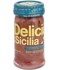 Філе анчоусів Сицилійської протоки в оливковій олії 100г. Анчоуси, виловлені на цій ділянці моря, мають ніжну консистенцію, і їх можна розпізнати за інтенсивним рожевим кольором і типовим і стійким запахом.