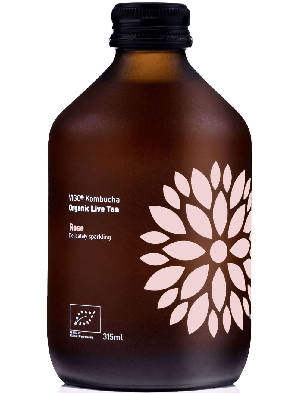 Склад: фільтрована вода, органічний ферментований чай (вода, органічна глюкоза, органічний чай, органічний сидровий оцет, культура комбуча), органічний тростинний цукор, вуглекислий газ, органічний екстракт шипшини (0,2%), екстракт троянди (0,07%). Підходить для веганів.