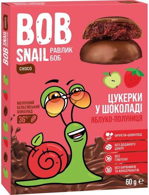 Склад: яблука, полуниці + молочний шоколад: сухе знежирене молоко, харчові волокна (олігофруктоза), какао-масло, какао терте, молочний жир, соняшниковий лецитин, натуральний ароматизатор ваніль, екстракт стевії.