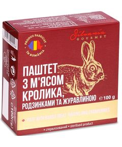 Склад: м'ясо кролика (30%) походження з ЄС, свинячий жир, вода, м’ясо свинини (20%) походження з ЄС, золотисті родзинки (6%), журавлина (6%), крохмаль, харчові волокна, рослинний білок, рисове борошно, сіль, натуральний ароматизатор (містить селеру), зневоднені овочі, спеції (чилі), глюкозний сироп, цукор (декстроза).