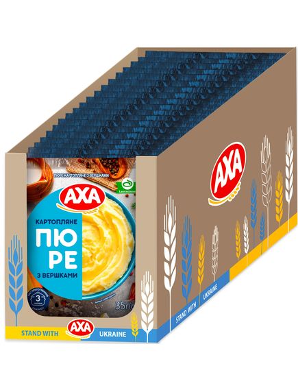 Склад: пластівці картопляні 66,5% (картопля сушена 99,4%, емульгатор моно – та дигліцеридів жирних кислот, стабілізатор пірофосфат натрієвої кислоти, антиоксидант аскорбілпальмітат, регулятор кислотності лимонна кислота, консервант метабісульфіт натрію), замінник вершків на рослинній основі (сироп глюкозний, гідрогенізована рослинна олія (соняшникова, пальмова), казеїнат натрію, стабілізатори: фосфат калію, поліфосфат, емульгатор моно та дигліцерідів жирних кислот, антиспікаючий агент Е 554), мальтодекстрин, суміш смако-ароматична вершки 4,0% (сіль кухонна, цукор, мальтодекстрин, підсилювачі смаку та аромату: глутамат натрію, інозинат натрію, гуанілат натрію, ароматичні компоненти, натуральні ароматичні речовини, регулятор кислотності молочна кислота, антиспікаючий агент діоксид кремнію), сіль кухонна, вершки сухі 1,0%, кріп сушений 1,0%, часник сушений 1,0%, перець чорний мелений. Може містити залишки злаків, що містять глютен, арахісу, горіхів, сої.