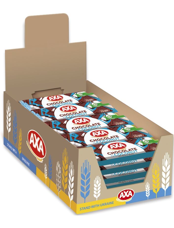 Склад: молочний шоколад 20% (цукор, какао-масло, молоко сухе незбиране, какао-маса, емульгатор соєвий лецитин, ароматизатор «ваніль), пластівці вівсяні 19,3%, патока крохмальна, кокосова стружка 17,3%, рисові кульки з какао 12,4% (крупа рисова, цукор, какао-порошок, ячмінно-солодовий екстракт, сіль кухонна, олія кукурудзяна, емульгатор соєвий лецитин), цукор, олія пальмова, загущувач: мальтодекстрин, сік яблучний концентрований, какао-порошок, вологоутримуючий агент: гліцерин, емульгатор: соєвий лецитин, сіль кухонна, регулятор кислотності: «лимонна кислота». Може містити сліди пшениці, арахісу, горіхів кеш’ю, мигдалю, фундука.