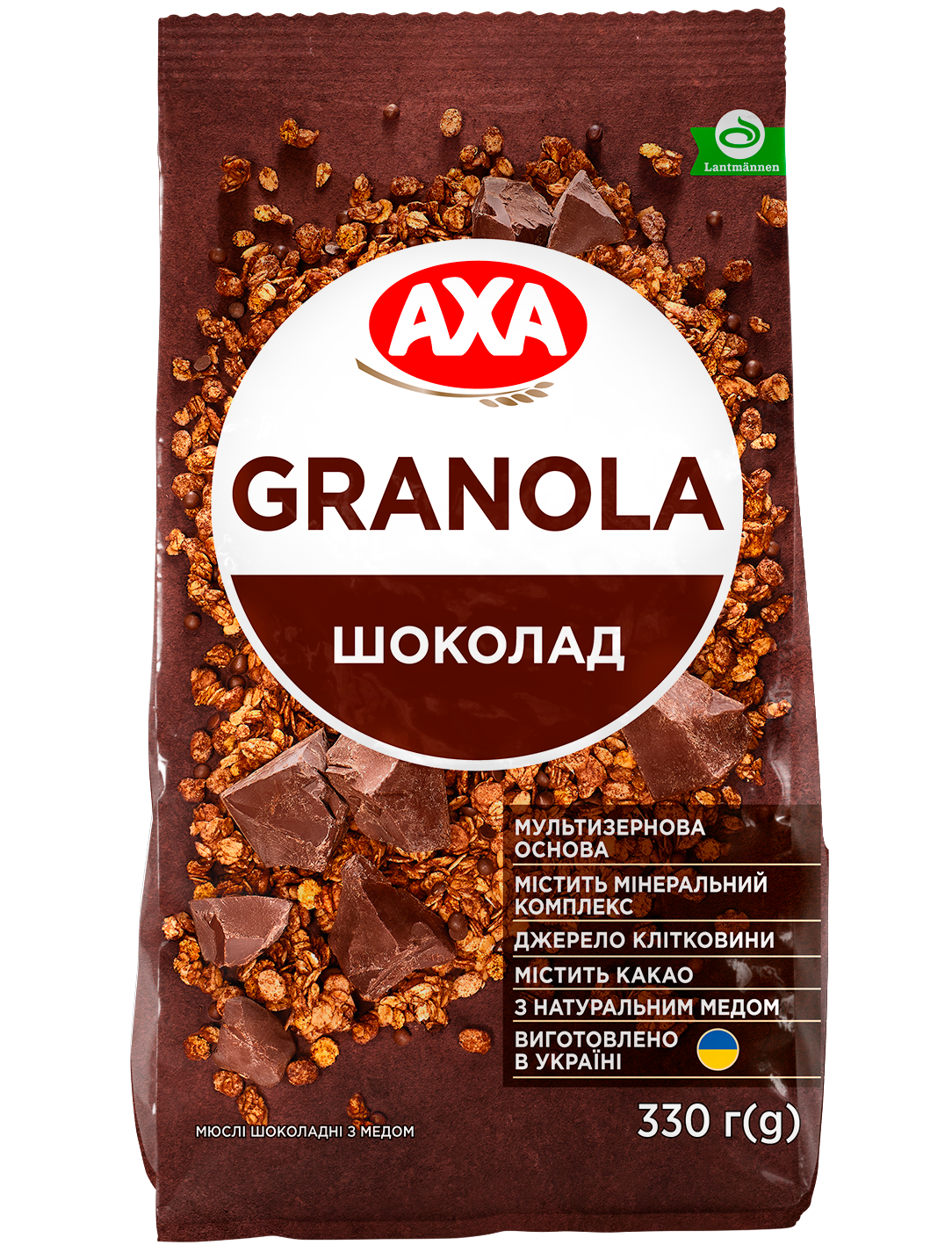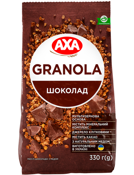 Склад: пластівці вівсяні 51%, цукор, кукурудзяні пластівці (крупа кукурудзяна, цукор, сіль кухонна), кульки пшенично-кукурудзяні (пшениця, крупа кукурудзяна, цукор, сіль кухонна, емульгатор соєвий лецитин, олія соняшникова), олія соняшникова високооленова рафінована дезодорована виморожена з антиоксидантом Е 306, сироп глюкозно-фруктозний, маса кондитерська 2,6. % (цукор, жир рослинний (олія пальмоядрова повністю гідрогенізована), какао-порошок зі зниженим вмістом жиру, емульгатор соєвий лецитин, сіль, ароматизатор «шоколад»), мед натуральнии 1,9%, маса шоколадна чорна 1,1% (какао терте, цукор, какао-масло, емульгатор соєвий лецитин, ароматизатор «ванілін»)), какао порошок зі зниженим вмістом жиру, сіль кухонна, ароматизатор «ваніль», мінеральний комплекс (мідь, заліво, марганець, селен, цинк, йод), вітамін Е. Може містити сліди арахісу, горіхів та молочних продуктів.