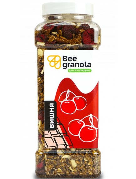 Склад: пластівці пшеничні, пластівці ячмінні, пластівці вівсяні, мед натуральний квітковий, вишня сублімована, пекан, мигдальні пластівці, шоколад білий, олія кокосова, глюкозно-фруктозний сироп, какао, сіль, вода питна.