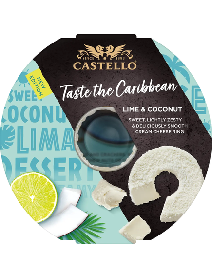 Вершковий сир Castello® з лаймом і кокосом перенесе ваші відчуття на піщані пляжі Карибського моря. З його збалансованими солодкими та свіжими нотками цей м’який вершковий сир є приємною закускою, яка однаково смакує як у солодких, так і в солоних стравах. Відмовтеся від повсякденного життя та насолодіться чарівним поєднанням розкішної вершкової та гладкої серединки лайма з щедрим покриттям ніжної кокосової стружки. Побалуйте себе цим солодким, пікантним якісним вершковим сиром на простому бісквіті або з улюбленими солодкими стравами. Ваша подорож до смаків Карибського моря починається тут.
