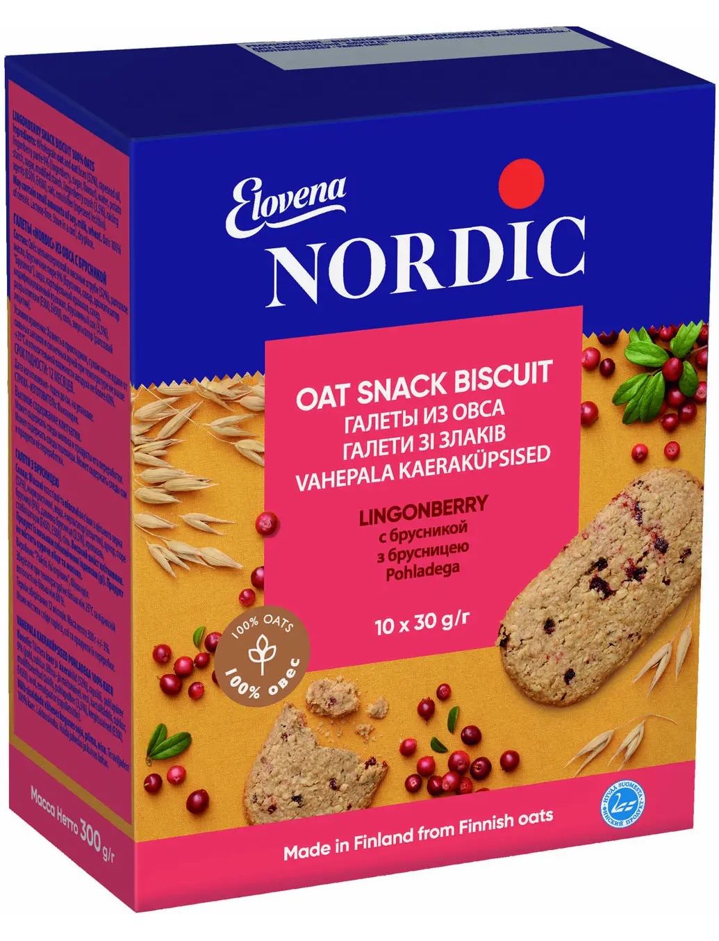 Галети з екологічно чистого фінської вівса з брусницею — смачний і корисний перекус в будь-якому місці і в будь-який час. Вони зроблені з цільних зерен з високим вмістом клітковини. Злакові, що входять до складу, дадуть вам заряд здорової енергії на тривалий час, а зручна індивідуальна упаковка кожної галети не займе багато місця.