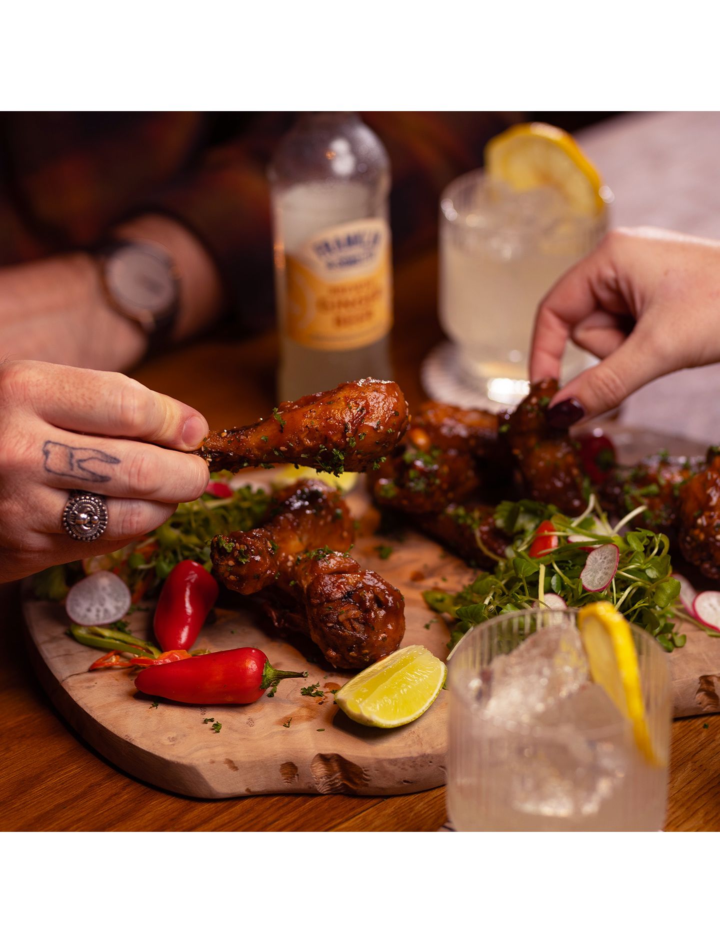 Теплота нашого насиченого імбирного пива Franklin & Sons підкреслює спеції, соєвий соус та солодкий мед, оживляючи курку та реберця.