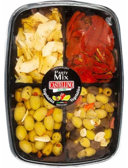 Cклад: овочі нарізані 55% (томати сушені, артишоки, оливки мариновані (оливки, перець, загущувач (Е401 (альгінат натрію) - Е412 (гуарова камедь)), оливки чорні та зелені без кісточок), соняшникова олія, сіль харчова, прянощі, оцет з білого вина, регулятор кислотності (кислота лимонна), антиоксидант (аскорбінова кислота), фіксатор кольору (глюконат заліза).