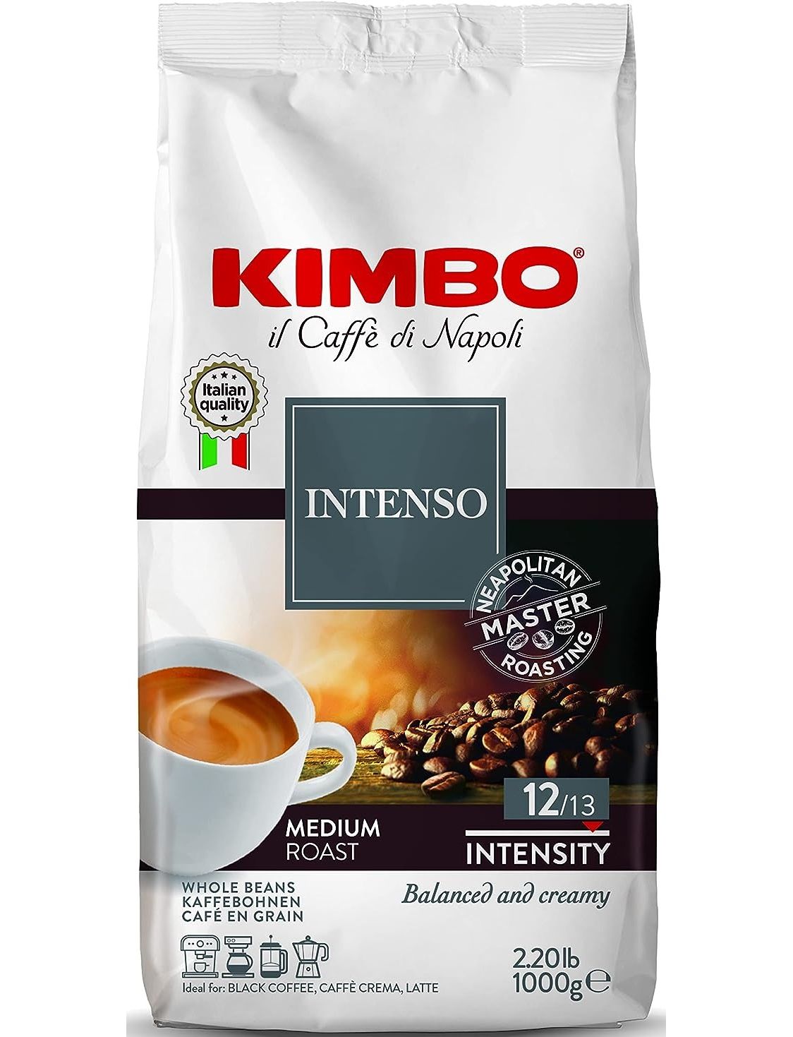 Kimbo, Италия / Aroma Intenso / оригинальный кофе в зернах Кимбо / традиционный итальянский кофе в зернах для приготовления по-настоящему ароматного напитка с мягким вкусом и легкими нотками какао / идеально подходит для приготовления эспрессо с мягким вкусом дома или в офисе / интенсивность выше среднего / средняя обжарка кофейных зерен / состав: 30% арабика и 70% робуста из Колумбии / обжарка и упаковка - в сердце Италии - Турине / большая герметичная упаковка сохраняет свежесть и ароматность кофейных зерен надолго / 1000 г
