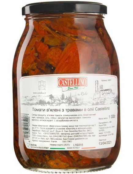 Склад: в'ялені томати, соняшникова олія, білий винний оцет, каперси, сіль харчова, спеції, регулятор кислотності (лимонна кислота), антиоксидант (L-аскорбінова кислота).