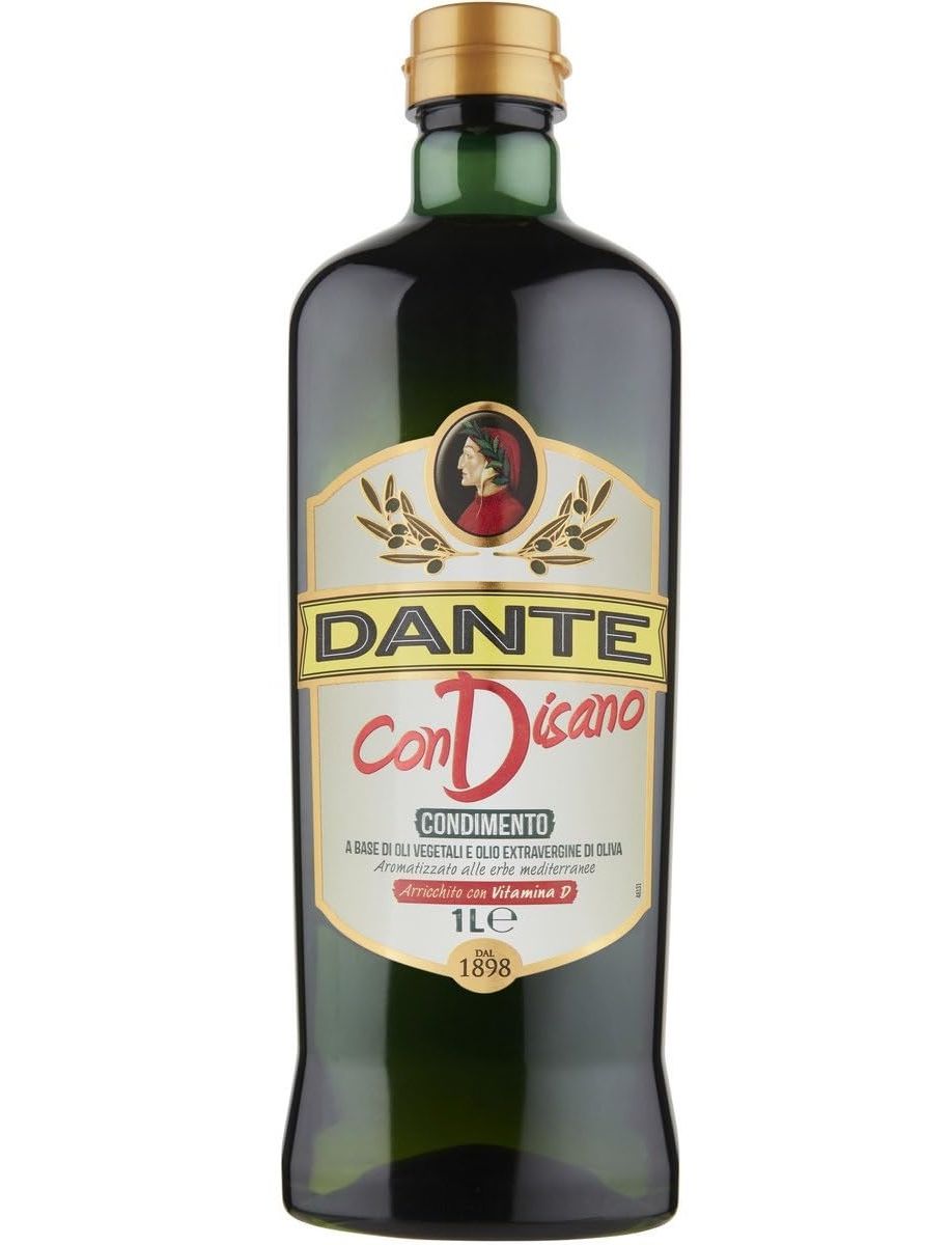 Dante ConDisano — це приправа , яка поєднує в собі смак і приємність: її склад складається з рослинних олій і оливкової олії першого віджиму (15%); він також приправлений середземноморськими травами та збагачений вітаміном D.