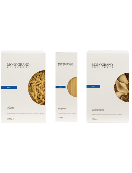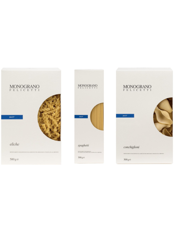 Matt - стійкий і насичений сорт пшениці вирощується на сонячних полях Апулії. Коли паста Matt готується, вона дарує чудовий літній аромат скошеної трави, висушеного кокосу та сиру. Старовинний смак нагадує приготований на камені хліб, масло і пагони бамбука.