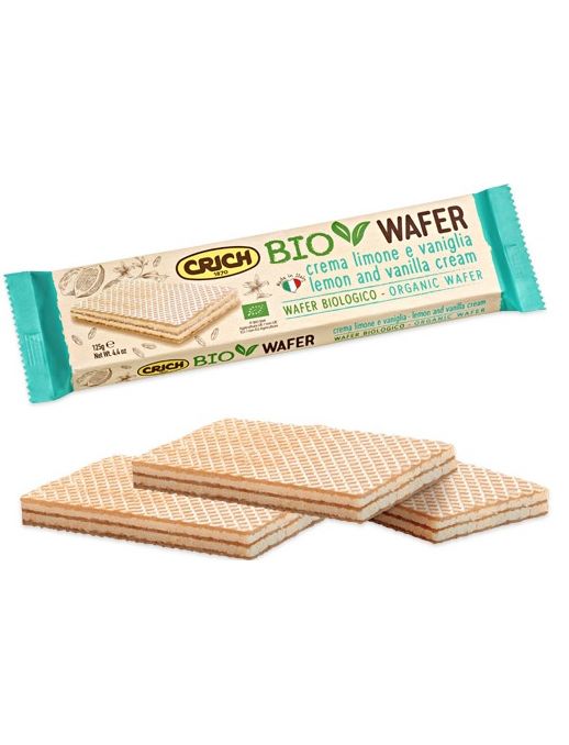 Crich, Италия / Wafer Crema Limone e Vaniglia / хрустящая вафелька с добавлением нежного крема c ванилью и лимоном / обладает особо хрустящей текстурой и насыщенным цитрусовым вкусом / идеально сочетается с кружкой горячего кофе, ароматного чая или молочного какао / абсолютно натуральный органический состав: кокосовое масло, мука пшеничная, тростниковый сахар, ваниль и лимон, крахмал, сухое обезжиренное молоко / 75% крема / вариант сладкого перекуса для детей и взрослых / удобный формат упаковки / 125 г