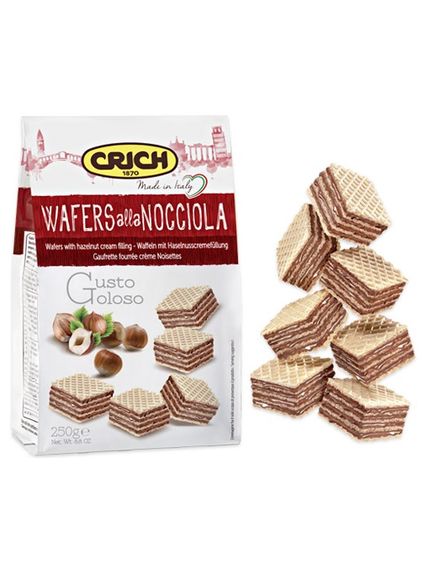 Доступны к заказу в количестве 10 шт. /// Crich, Италия / Wafers alla Nocciola / набор хрустящих вафельных квадратиков с кремом на основе ореховой пасты / вафельки обладают особо хрустящей текстурой и насыщенным вкусом / идеально сочетаются с кружкой горячего кофе, ароматного чая или молочного какао / 80% крема / вариант сладкого лакомства для детей и взрослых / удобный формат упаковки / 250 г
