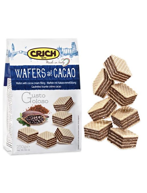 Crich, Италия / Wafers al Cacao / набор хрустящих вафельных квадратиков с добавлением нежного какао-крема / обладают особо хрустящей текстурой и насыщенным шоколадным вкусом / идеально сочетаются с кружкой горячего кофе, ароматного чая или молочного какао / 80% крема / вариант сладкого перекуса для детей и взрослых / удобный формат упаковки / 250 г