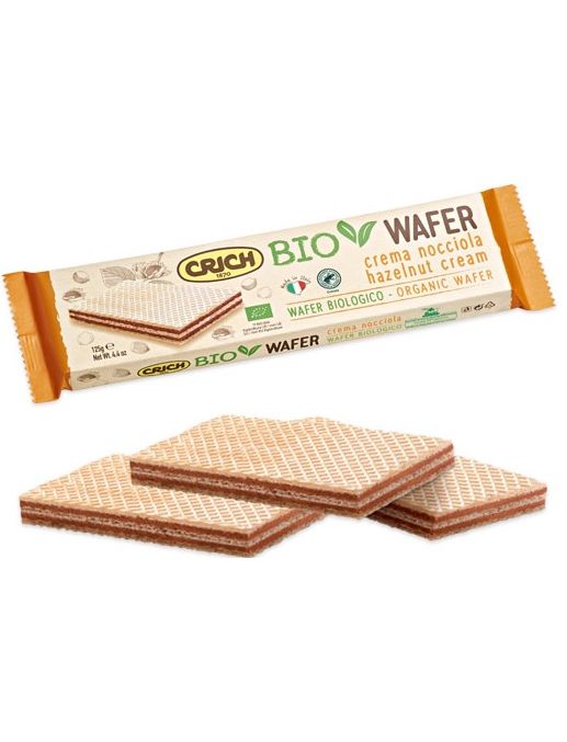 Crich, Италия / Wafer al Crema Nocciola / хрустящая вафелька с добавлением нежного крема c лесными орешками / обладает особо хрустящей текстурой и насыщенным вкусом / идеально сочетается с кружкой горячего кофе, ароматного чая или молочного какао / абсолютно натуральный органический состав: кокосовое масло, мука пшеничная, тростниковый сахар, орехи, крахмал, сухое обезжиренное молоко / 75% крема / вариант сладкого перекуса для детей и взрослых / удобный формат упаковки / 125 г