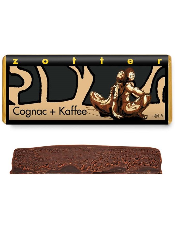 Французький старий коньяк наповнює ганаш з чорного шоколаду округлим і насиченим смаком. А оскільки коньяк закінчується нотами смаженої кави, покриття цього творіння доречно зроблено з кавового кувертюру. Звичайно, тому що Zotter також обсмажує каву у власній обсмажувальній. Для цього кавові зерна арабіки привозять із високогір’я Мексики та Колумбії.