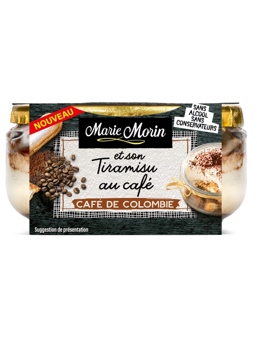 Склад: маскарпоне, яєчний білок, цукор, яєчний бісквіт 12,5% (цукор, яйця 35%, пшеничне борошно, інвертний цукровий сироп, яєчні жовтки, сіль), жирні вершки, кавовий сироп 0,5% (вода, цукор, колумбійський кавовий екстракт 2,9%), ванільний сироп (вода, цукор, ванільний екстракт), какао-порошок 0,01%. Можливі сліди горіхів.