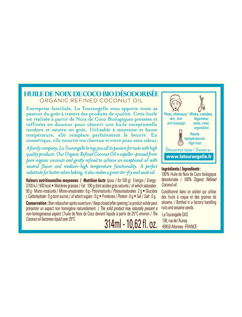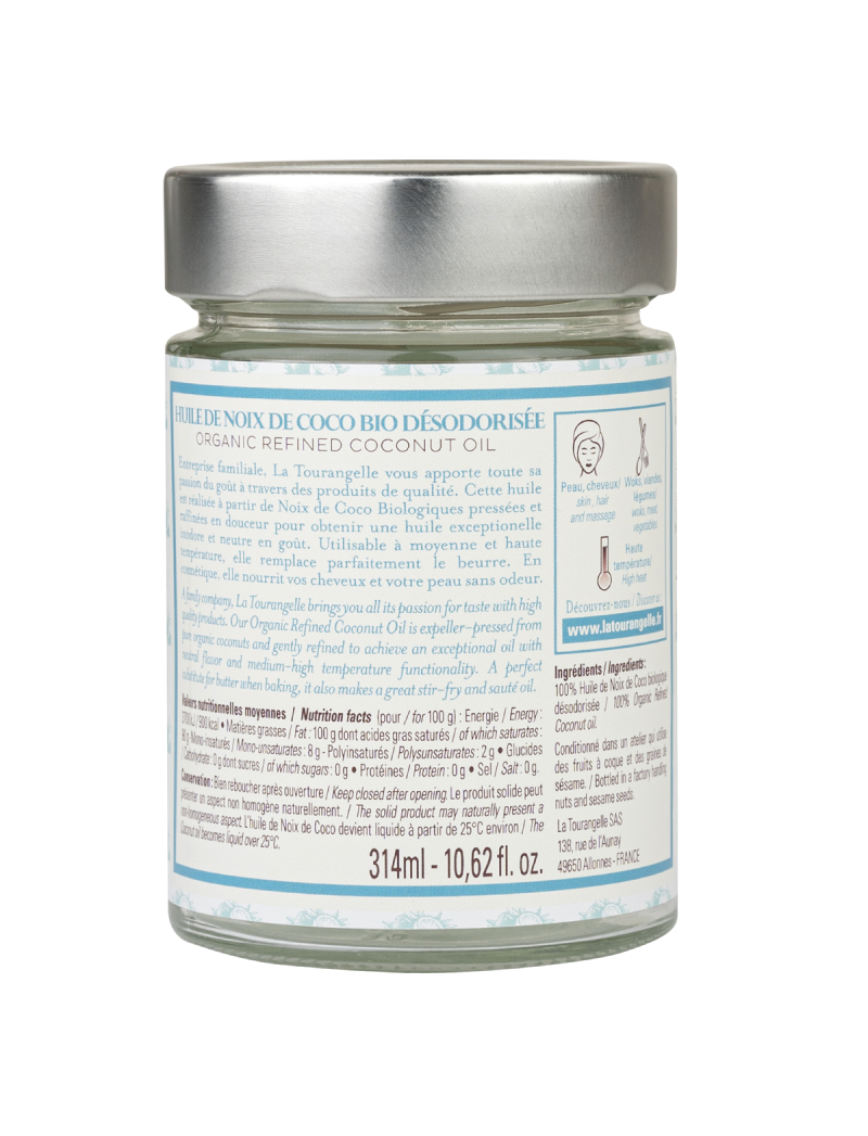 Органічна рафінована кокосова олія La Tourangelle – це просто кокос. Наша олія віджимається експелером (без гексану) з чистих органічних кокосових горіхів і ретельно очищається для отримання виняткової кокосової олії з нейтральним смаком і функціональністю при високій температурі. Ідеальний замінник шортенгу для соте, запікання або смаження. Наша органічна очищена кокосова олія є здоровим зволожувачем для шкіри та волосся, чудово захищає та прикрашає.