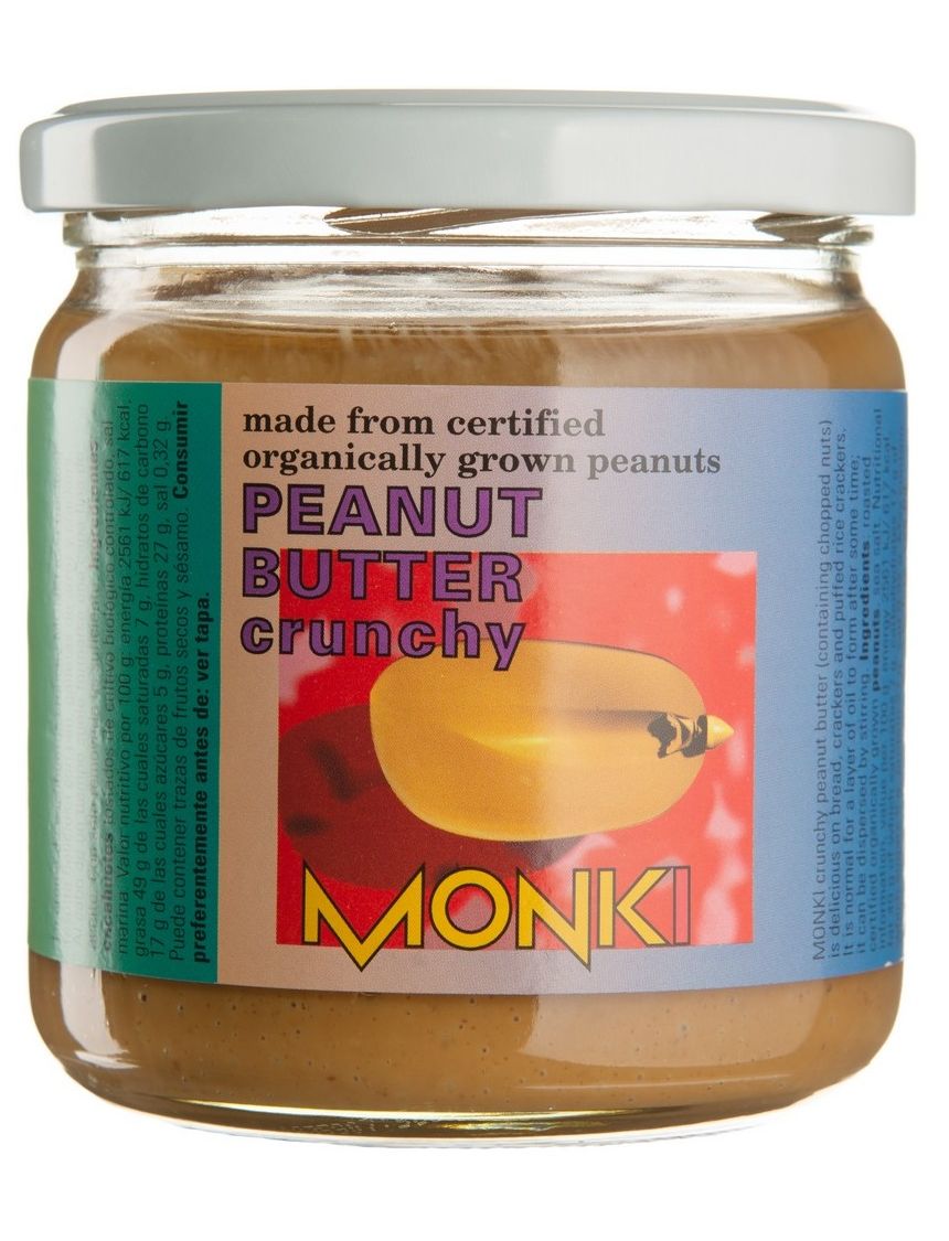 Арахісова паста MONKI "Хрустка" (з шматочками) дуже смачна до хліба, крекерів і рисових коржів. Це нормально, якщо через деякий час утворюється масляна плівка. Тоді достатньо перемішування. Склад: смажений арахіс із сертифікованого органічного вирощування, морська сіль. Може містити сліди горіхів і кунжуту.